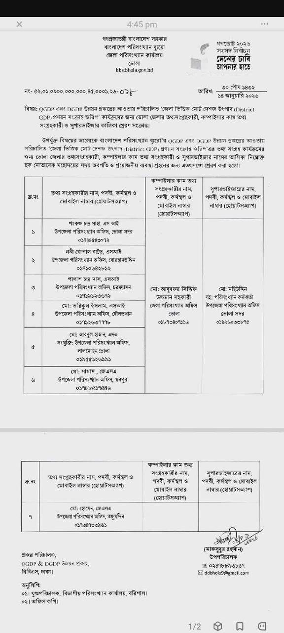 | ১ | ত্রৈমাসিক মোট দেশজ উৎপাদন QGDP এবং জেলা ভিত্তিক মোট দেশজ উৎপাদন DGDP উন্নয়ন প্রকল্প জরিপ। | | ১৭-০১-২০২৬ | দেখুন | |
